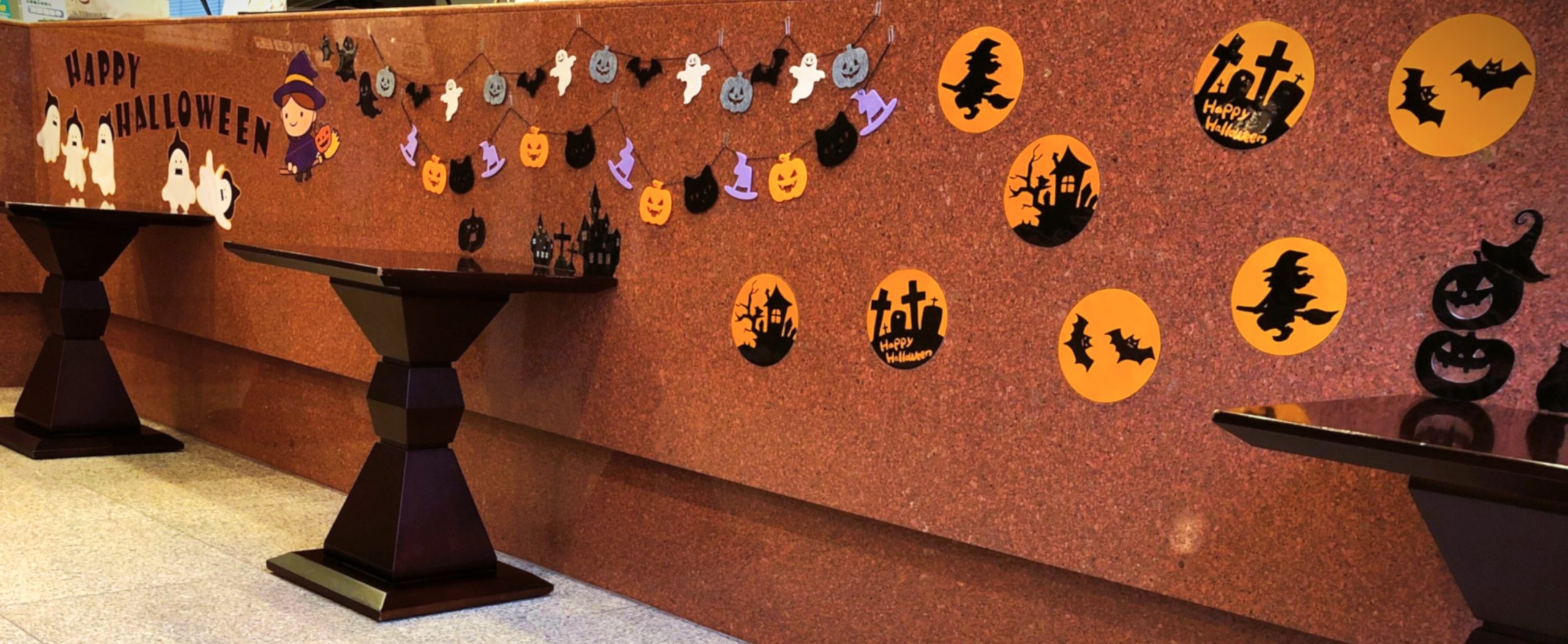 フロント周りをハロウィン仕様に飾り付けいたしました。