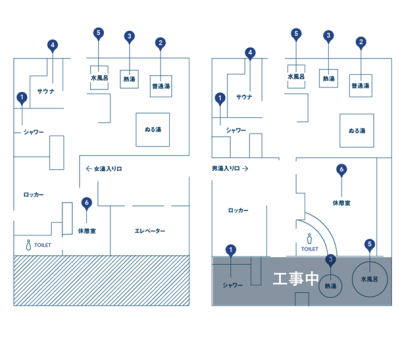 男湯側の洞窟風呂と外気浴ゾーンについては、現在最終調整を行っており、1月5日(月)までご利用いただけません。ご了承ください。